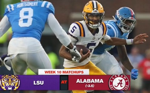 Battle for supremacy in the SEC West takes place when the #14 LSU Tigers travel to take on their rival the #8 Alabama Crimson Tide. Both teams had a bye last week. LSU's last game was a glorified practice against Army, as they destroyed the Black Knights 62-0 as 33-point favorites. Alabama had a much more difficult opponent, as they took down #17 Tennessee at home 34-20 as 8.5-point favorites. LSU won last year's matchup against Alabama at home 32-31. Bama is currently listed as 3-point home favorites. Kickoff is scheduled for 7:45 EST from Bryant-Denny Stadium in Tuscaloosa, and can be found on CBS.